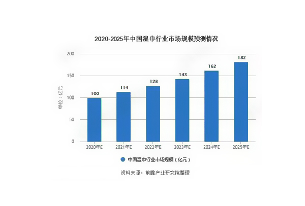 隨著國民衛(wèi)生健康意識(shí)提升以及消費(fèi)能力提高,后疫情時(shí)代濕巾行業(yè)有望進(jìn)一步突破,預(yù)計(jì)2025年市場規(guī)模有望達(dá)到182億元。----數(shù)據(jù)來源:前瞻產(chǎn)業(yè)研究院。